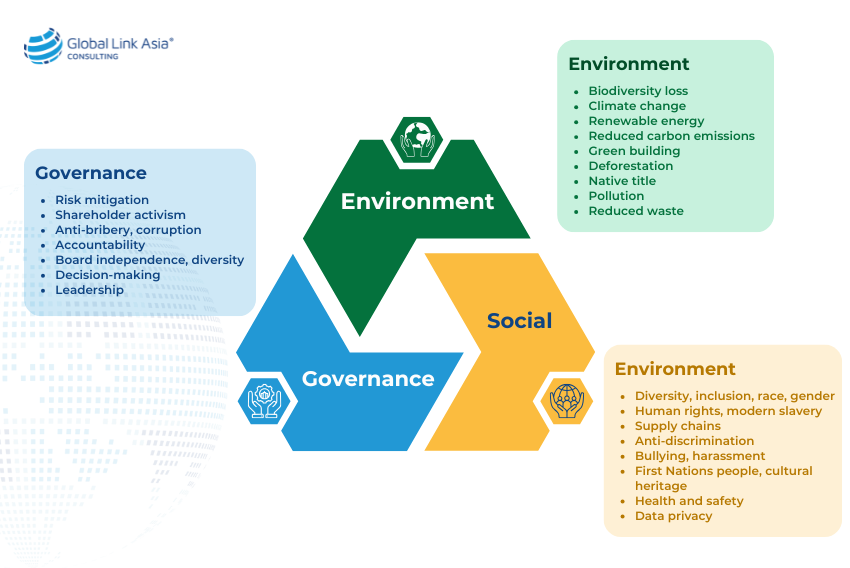 ESG (Environment, Social, Governance) là ba yếu tố cốt lõi trong đánh giá mức độ bền vững và trách nhiệm của doanh nghiệp. Cụ thể: