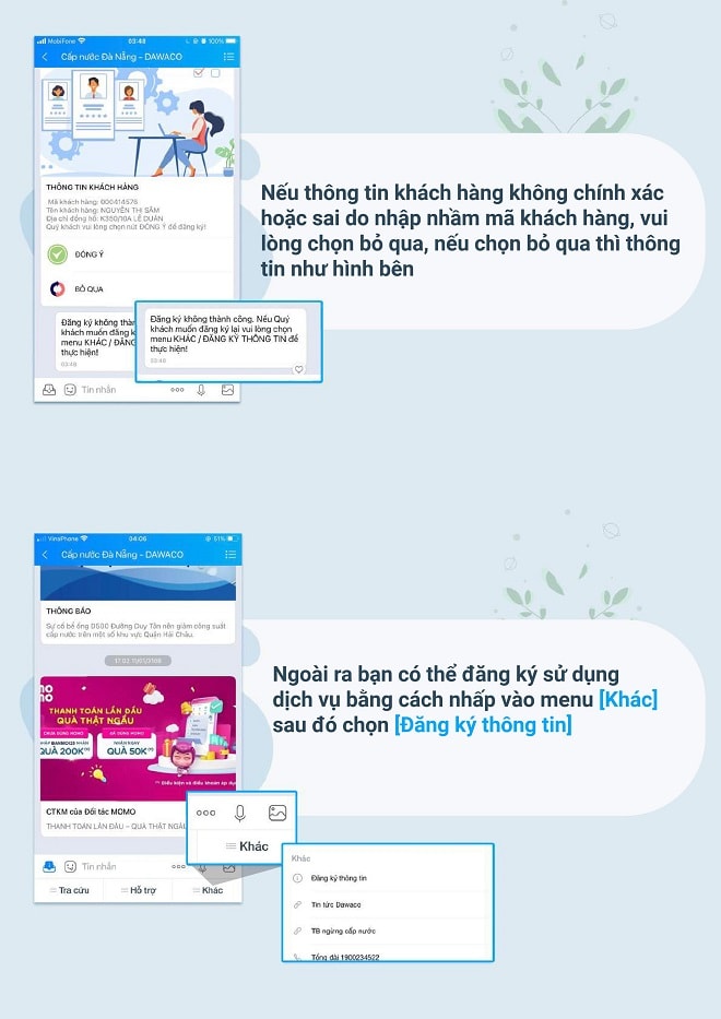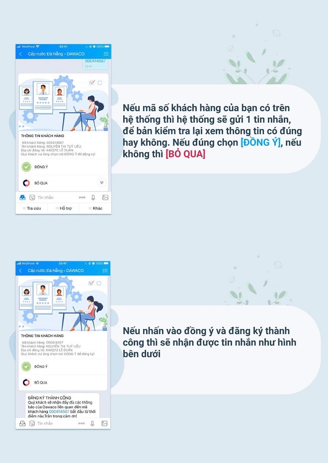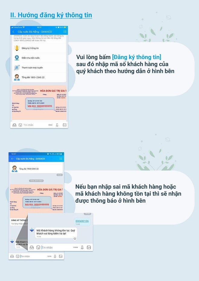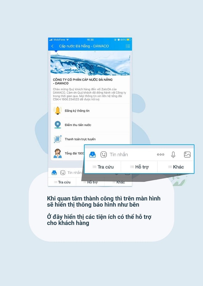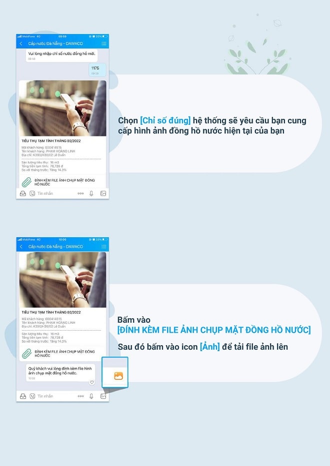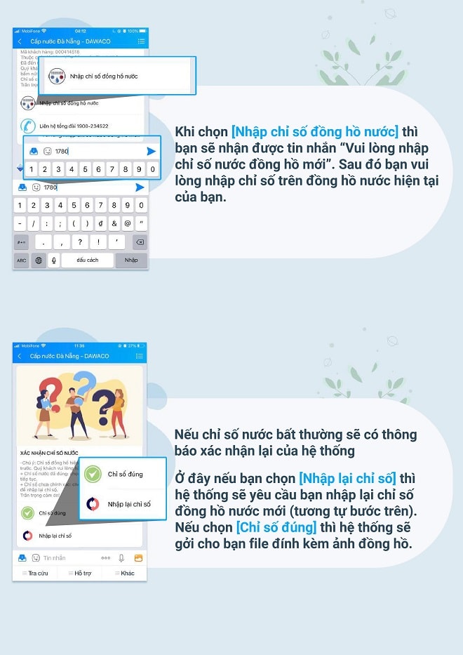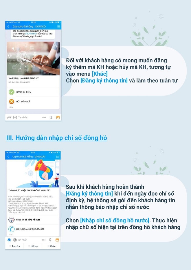 Với việc đăng ký tương tác cùng với Công ty CP Cấp nước Đà Nẵng (Dawaco) qua tài khoản ứng dụng Zalo thì hằng tháng đến ngày ghi chỉ số sử dụng nước Dawaco chủ động gửi tin nhắn thông báo đến khách hàng. Khách hàng đăng nhập vào tài khoản theo mã khách hàng (KH) đã đăng ký để tự khai báo chỉ số sử dụng nước và đính kèm file ảnh hình ảnh hiển thị đồng hồ đo chỉ số nước và bấm gửi qua hệ thống. Sau xử lý thông tin khách hàng, Dawaco gửi tin nhắn thông báo đến khách hàng chi tiết chỉ số, khối lượng nước sử dụng và số tiền phải thanh toán.