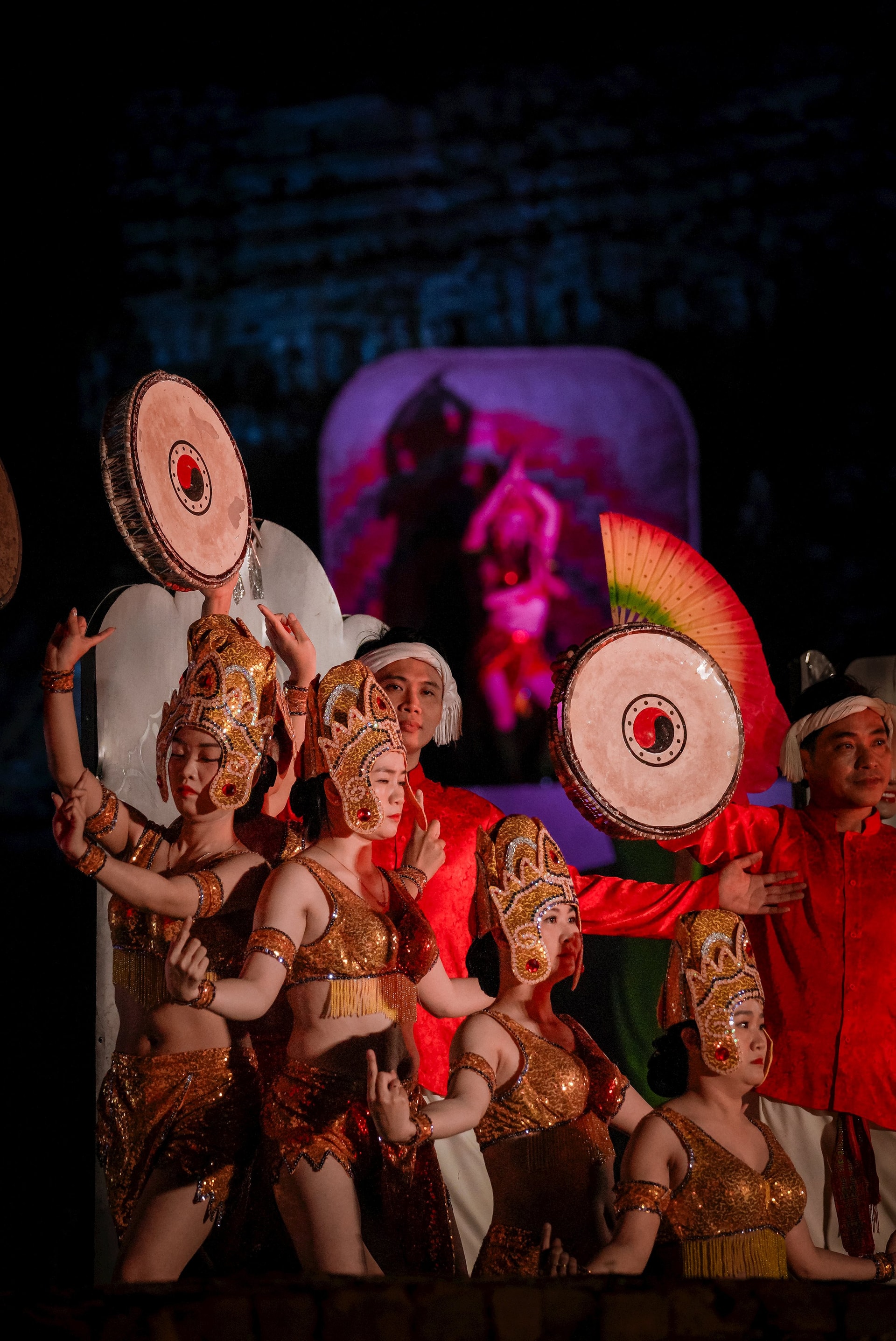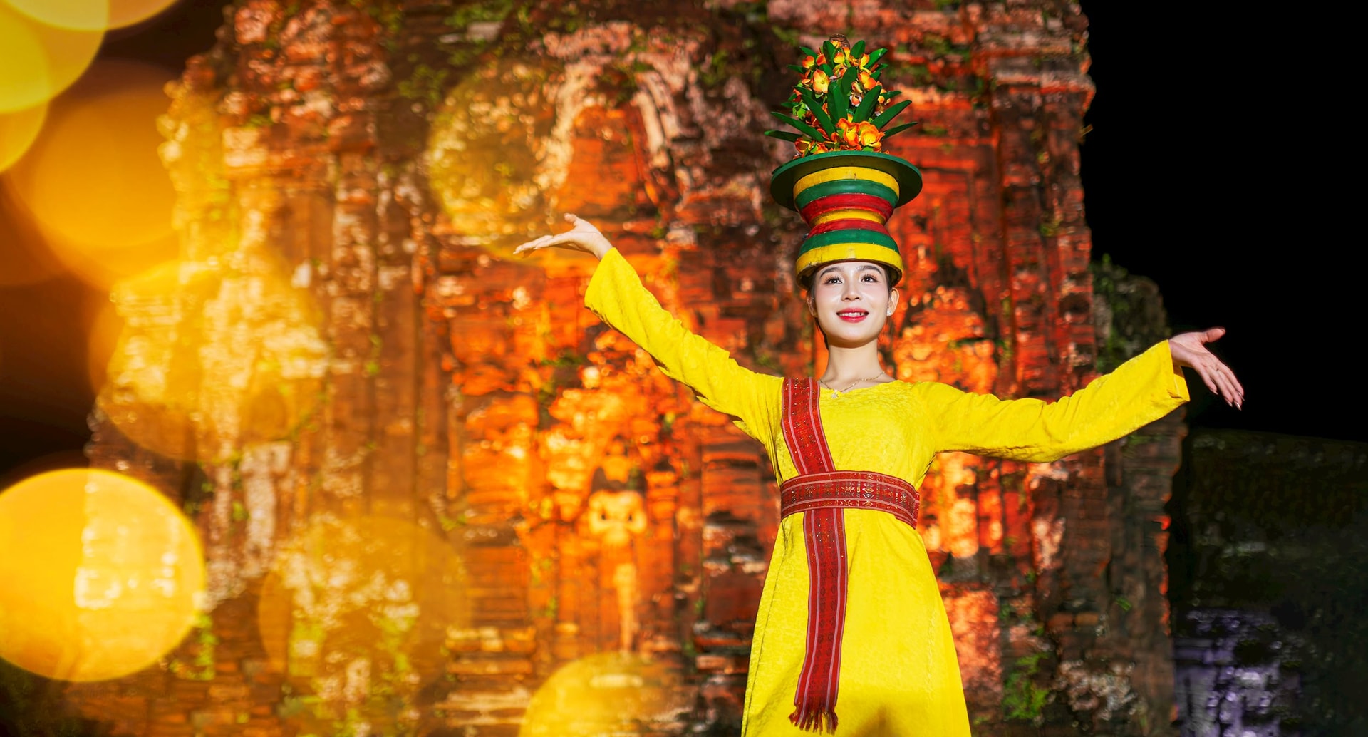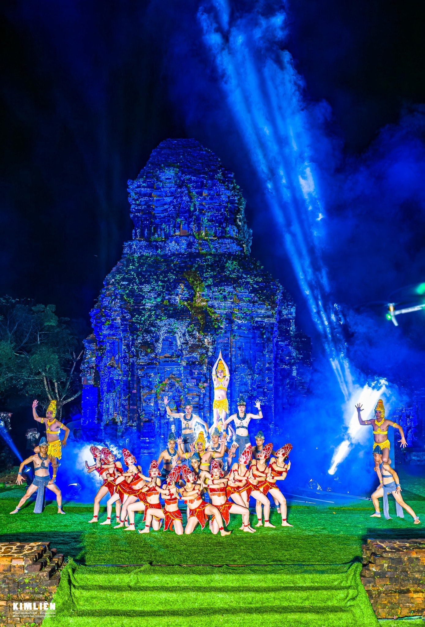 “Đêm Mỹ Sơn huyền thoại” truyền tải thông điệp đến khán giả bằng nhiều loại hình ngôn ngữ nghệ thuật. Ảnh: NGUYỄN XUÂN HÀSự phối hợp giữa các ngôn ngữ múa cùng kỹ xảo ánh sáng cũng như hiệu ứng sân khấu đã tạo nên màn trình diễn chân thực, đầy ấn tượng. Ảnh: PHÙNG QUANG HƯNGTrên nền gạch đá rêu phong, những hoa văn và linh vật xưa vẫn vọng lên câu chuyện về một trung tâm tôn giáo linh thiêng bậc nhất của vương quốc cổ. Ảnh: HUỲNH VĂN TRUYỀNChương trình nghệ thuật ngoài trời được dàn dựng công phu, quy mô với gần 100 diễn viên tham gia biểu diễn. Ảnh: HUỲNH VĂN TRUYỀNNhững vũ nữ Apsara xuất hiện với điệu múa thanh thoát gợi nhắc truyền thuyết Ấn Độ. Ảnh: NGUYỄN XUÂN HÀNhững điệu múa Chăm uyển chuyển. Ảnh: ĐẶNG CÔNG PHƯƠNG"Đêm Mỹ Sơn huyền thoại” đưa du khách vào hành trình nghệ thuật, ánh sáng và lịch sử. Ảnh: HUỲNH VĂN TRUYỀNMỹ Sơn ngày nay vẫn uy nghiêm và trầm mặc, như một minh chứng sống động của nền văn minh cổ. Ảnh: HUỲNH VĂN TRUYỀN