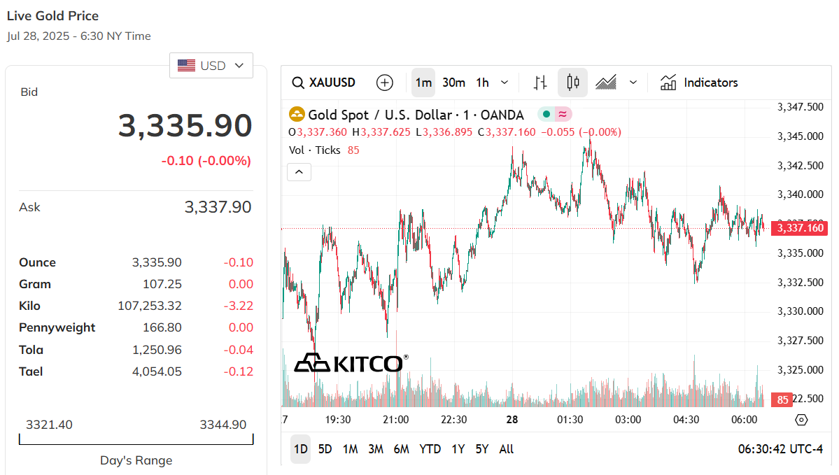 Giá vàng quốc tế hôm nay, ngày 28/7/2025, đang giữ mức ổn định, chịu tác động từ các yếu tố đối nghịch trên thị trường. Một mặt, tin tức về một thỏa thuận thương mại sơ bộ giữa Mỹ và Liên minh Châu Âu (EU) đã thúc đẩy tâm lý lạc quan của nhà đầu tư, làm giảm nhu cầu trú ẩn an toàn vào vàng và kìm hãm đà tăng giá. Tuy nhiên, mặt khác, giới đầu tư đang nóng lòng chờ đợi cuộc họp chính sách của Cục Dự trữ Liên bang Mỹ (Fed) vào cuối tuần này. Nếu thỏa thuận thương mại giúp giảm bớt lo ngại lạm phát, Fed có thể xem xét hạ lãi suất trong tương lai gần – một động thái thường có lợi cho giá vàng, vì khi đó, chi phí cơ hội của việc nắm giữ tài sản không sinh lời như vàng sẽ giảm đi.