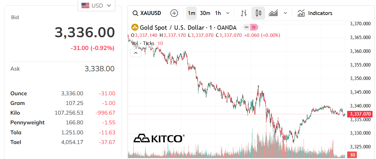 Giá vàng thế giới, lúc 05h00 ngày 27/7/2025 (giờ Việt Nam), giá vàng thế giới giao ngay ở mức 3336,0 USD/ounce. Giá vàng hôm nay giảm 31,0 USD. Quy đổi theo tỷ giá USD tại ngân hàng Vietcombank (26.300 VND/USD), vàng thế giới có giá khoảng 110,11 triệu đồng/lượng (chưa tính thuế, phí). So sánh với giá vàng miếng SJC trong nước cùng ngày (119,6-121,1 triệu đồng/lượng), giá vàng SJC hiện cao hơn giá vàng quốc tế khoảng 10,99 triệu.