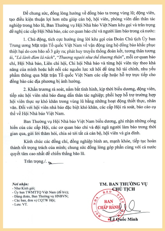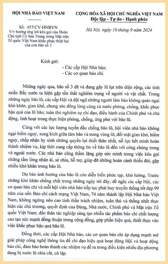 ĐNO - Những ngày qua, cơn bão số 3 (bão Yagi) - cơn bão mạnh nhất trong nhiều thập kỷ qua đã để lại những hậu quả nặng nề về người và tài sản ở các tỉnh, thành phố phía Bắc. Hội Nhà báo Việt Nam đã có thư kêu gọi ủng hộ nhân dân các tỉnh, thành phố phía Bắc khắc phục hậu quả thiên tai.