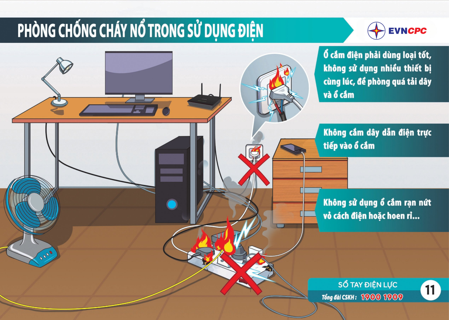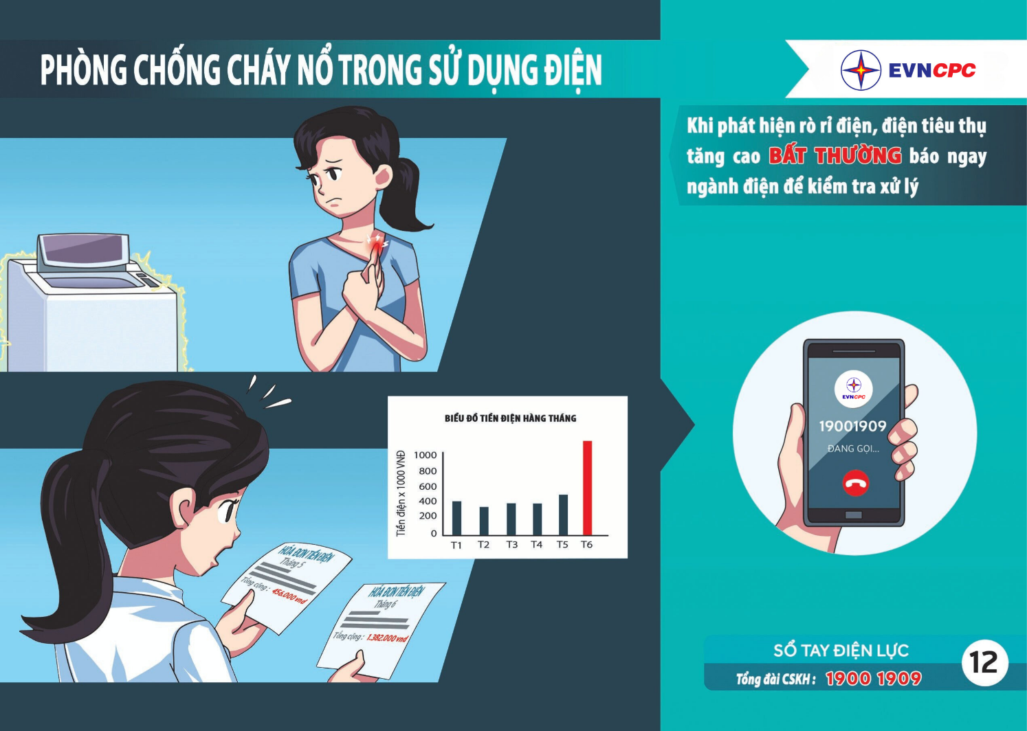6. Báo ngay tổng đài chăm sóc khách hàng 19001909 khi phát hiện rò rỉ điện, điện tiêu thụ tăng cao bất thường… để ngành điện kiểm tra xử lý.