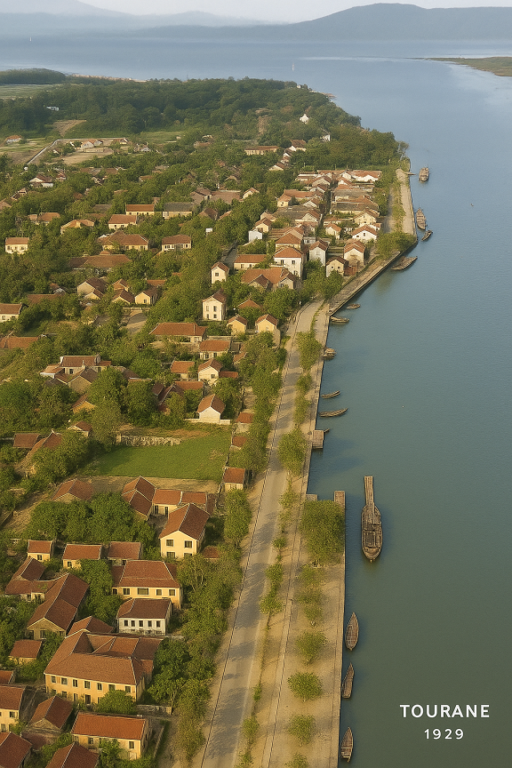 Không ảnh tái hiện đô thị Tourane dưới thời Pháp thuộc, nhìn từ phía Nam lên Bắc, với sông Hàn nằm bên phải khung hình. Trục đường chính chạy dọc bờ sông là Quai Courbet (nay là Bạch Đằng), nơi tập trung các công trình hành chính, công cộng và thương mại do người Pháp quy hoạch. Xen giữa là khu dân cư biệt thự kiểu Pháp, mái ngói đỏ, tường vàng nhạt, bao quanh bởi cây xanh và lối đi. Xa xa là vùng rừng hướng ra Tiên Sa và bán đảo Sơn Trà. Toàn cảnh phản ánh rõ nét một mô hình “thuộc địa vi mô” được tổ chức bài bản giữa lòng xứ bảo hộ An Nam.