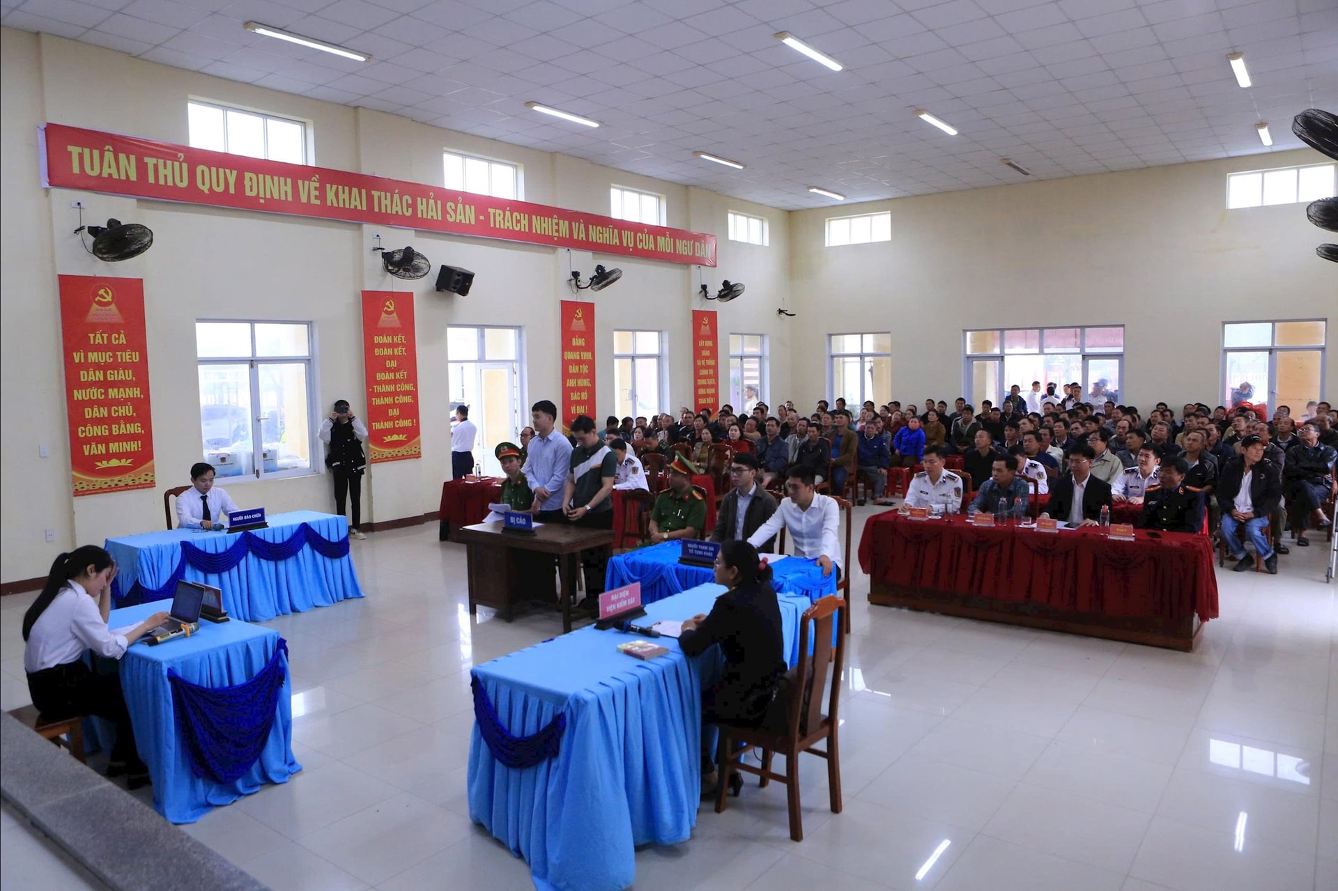 Đáng chú ý là các hành vi: đưa tàu cá khai thác trái phép ở vùng biển nước ngoài; cố tình tắt hoặc làm mất kết nối thiết bị giám sát hành trình (VMS) nhằm né tránh sự kiểm soát của cơ quan chức năng; sử dụng hồ sơ, giấy tờ tàu cá không hợp pháp hoặc giả mạo; không khai báo, khai báo không trung thực nhật ký khai thác; không đủ điều kiện pháp lý về giấy phép khai thác, thuyền trưởng, thuyền viên theo quy định. Theo phân tích tại phiên tòa, những hành vi này không chỉ vi phạm Luật Thủy sản mà còn có thể bị xử lý hình sự theo các điều khoản của Bộ luật Hình sự.