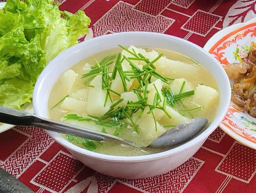 Nhắc nồi canh ra khỏi bếp, má đảo đều tay, múc ra tô rồi rắc thêm nắm lá nén, lá nghệ, ngò tây hay lá gừng đã được thái nhỏ lên trên, quây quần thưởng thức trong niềm hạnh phúc ngọt ngào.