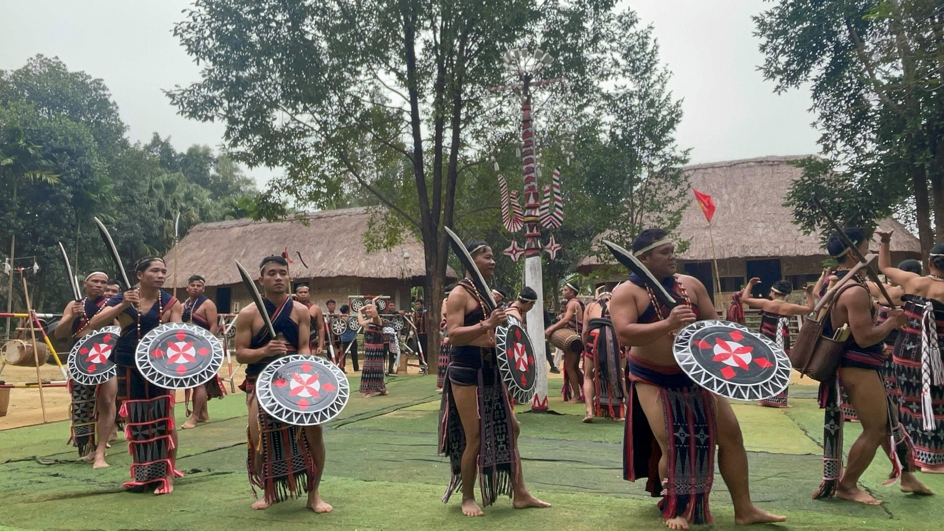 Hơn 30 nghệ nhân, diễn viên quần chúng Cơ Tu trong sắc màu trang phục truyền thống rực rỡ hòa cùng tiếng trống chiêng vang lên rộn rã đã trình diễn một chương trình đậm bản sắc văn hóa của đồng bào Cơ Tu.
